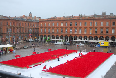 I choose this photo when Kenzo 'planted a field' of 200,000 red paper poppies in front of the Place du Capitole in Toulouse, on Friday September 4th. The poppies were remained until the following day, and had been given away to passers-by. The event is in honor of their poppy-inspired fragrance, Flower by Kenzo.